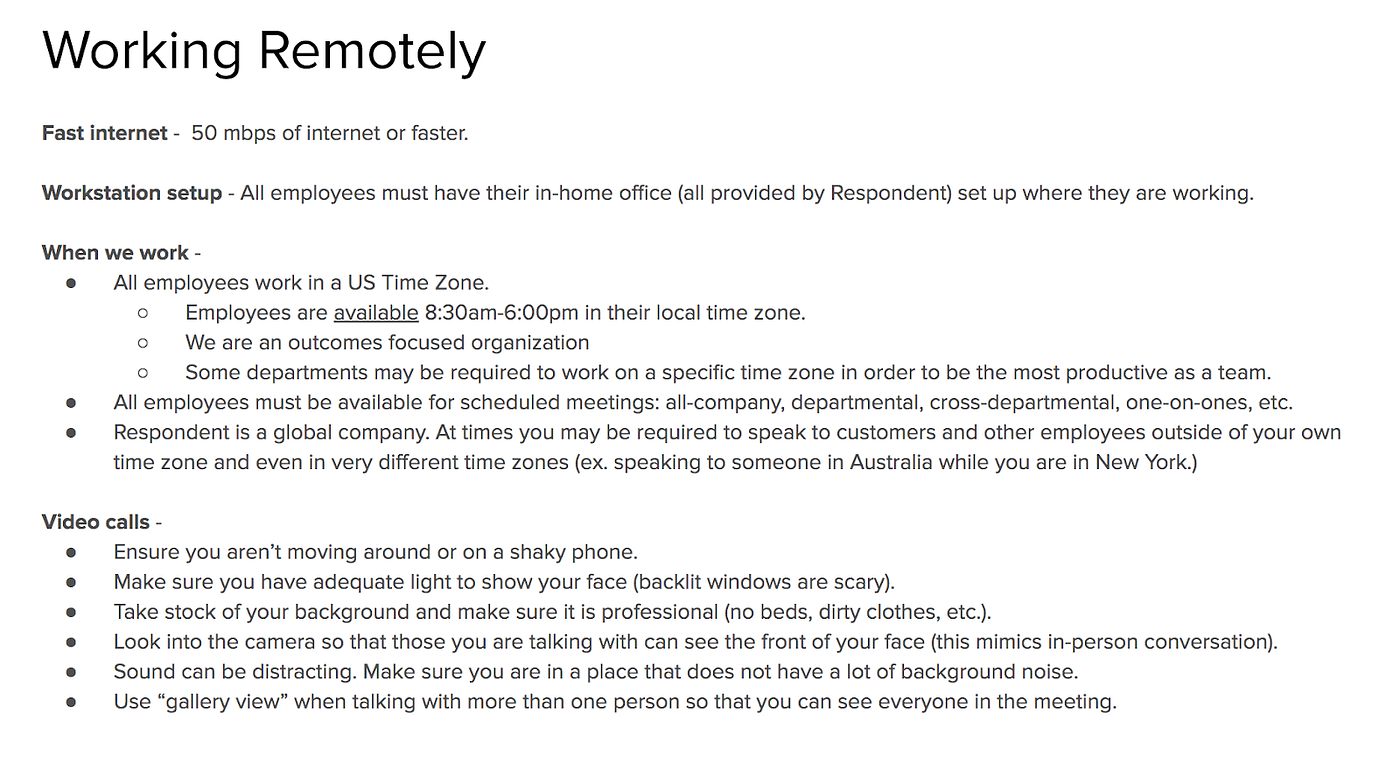 Video — At Respondent, we always use video calls in order to mimic in-person communication. On a new employee’s first day, we outline video call etiquette so that meetings are as effective and productive as possible.