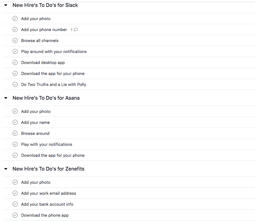 While this may seem like a lot of tools to use across the company, using them consistently and outlining their use-cases and purpose explicitly helps new-hires acclimate smoothly. Once new employees have an understanding of the tools we use, we provide them with checklists in Asana to set themselves up properly in each app: