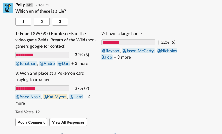 For fun, we also ask new employees to play Two Truths and a Lie using a poll in Slack.