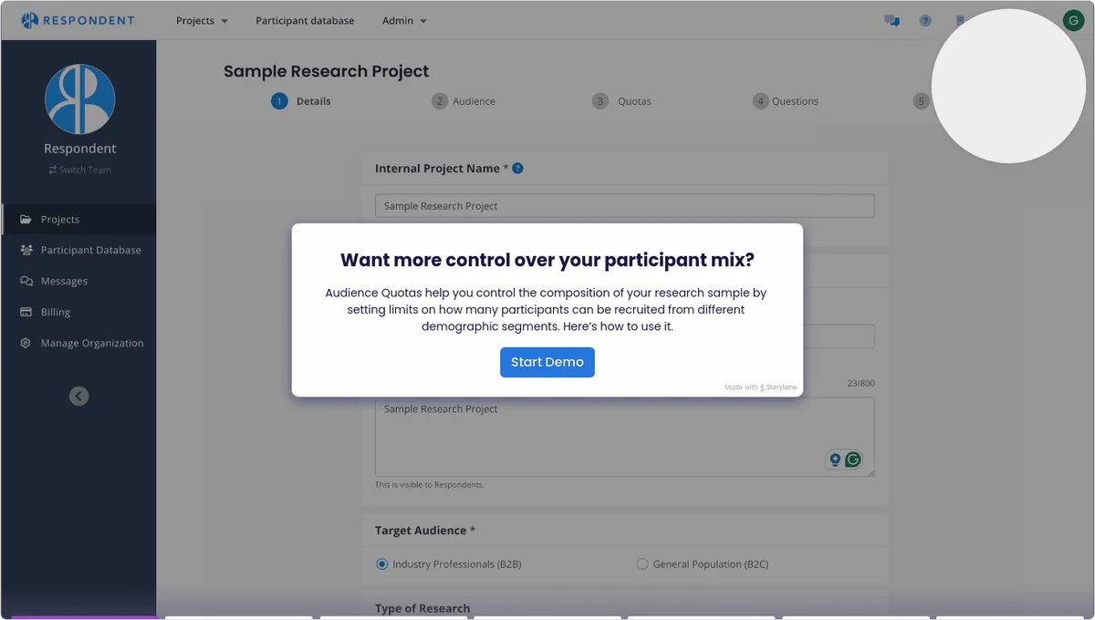 Example: Want 50 participants split evenly by gender? Or a healthy spread across age groups? When you build your project, set your quotas, and Respondent will take care of the rest.
