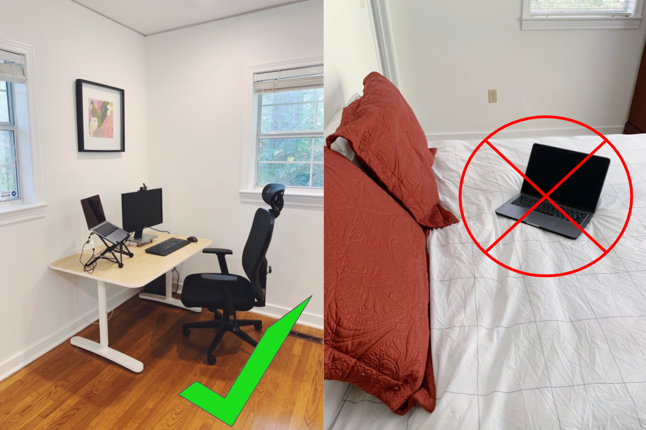 Your workspace is your first tool of productivity. Comfort is key — but not bed-comfortable. You need a proper work station with your screen as close to eye-level as you can get it. An area separate from your living space is also helpful. Avoid the kitchen table if you can.