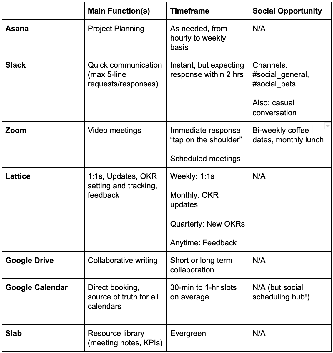 Maybe everyone at your company works in the same time zone. Establishing norms around when everyone is expected to be available will prove essential to productive remote teamwork and communication.